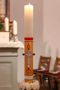 Paschal candles feature a cross, the letters alpha (Α) and omega (Ω), and the year, as well as five nails (often covered in red wax) which are inserted into the candle to symbolize the five wounds of Christ (right hand, left hand, right foot, left foot, and side).